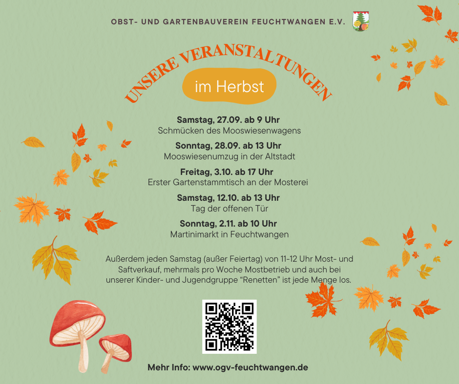 Jeden Samstag von 11:00-12:00 Uhr ist bei uns im Vereinsgebäude in Aichenzell 19 Most- und Saftverkauf. Hier kann sich jeder mit unseren Produkten eindecken. Mitglieder bekommen 10 % Rabatt auf die regulären Verkaufspreise. Nähere Informationen gibt es hier!